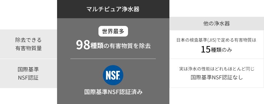 一方、水質に難がある米国で生まれ、国際基準NSF認証を受けているマルチピュアの浄水器は、ウィルス、バクテリア、ヒ素、PFOS/PFOAなども含め、計104項目の除去項目をクリアしています。