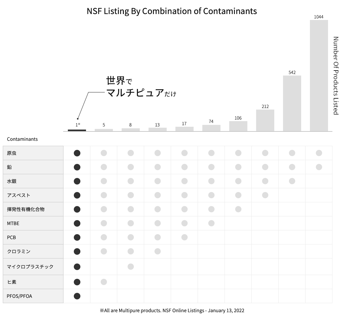 そして、PFOS/PFOAやヒ素を含めた100種類以上の有害物質を除去できる製品は、マルチピュアの1種類のみです。(2022年12月NSFリスティングより)