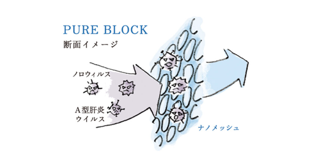微粉レベルの粒まで粉砕された活性炭を使ったブロック活性炭フィルターに、PURE BLOCKの技術を組み合わせて利用することで、薬品や電力を用いることなくウィルスを除去することに成功しました。