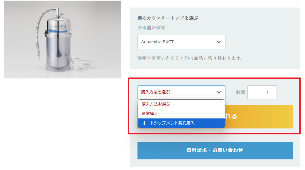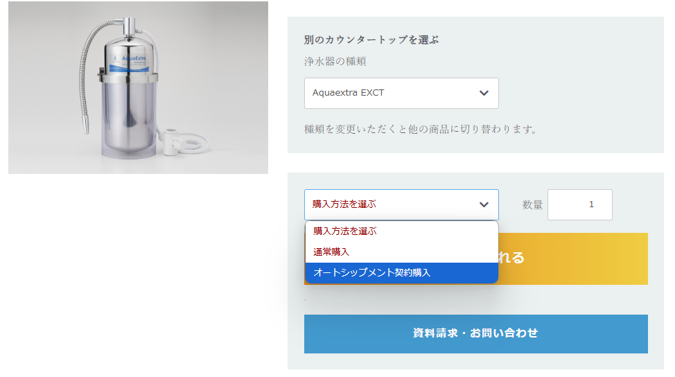 マルチピュア公式オンラインショップの商品ページにはいると、上のような購入画面が出ます(イメージ例は、Aquaextra EXCTの場合)。