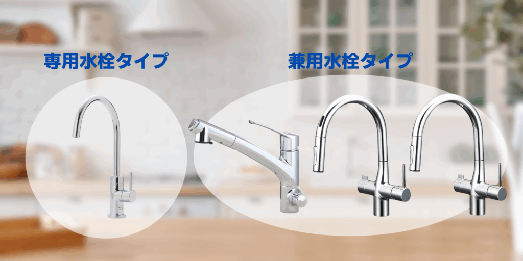 水栓の種類は、浄水器専用の水栓を設置する「専用水栓タイプ」が2種類と、1本の水栓で水道水のお水・お湯と浄水器を使い分ける「兼用水栓タイプ」が2種類あります。