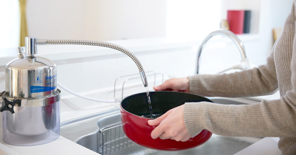 カウンタートップタイプの浄水器は、設置が楽にできるだけでなく、お手入れがしやすいのも特徴のひとつです。忙しい子育て世帯はもちろん、老後の暮らしでも安心してご利用いただけます。