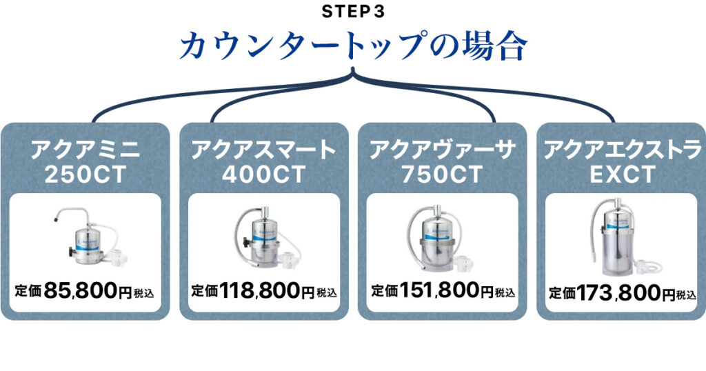 カウンタートップタイプの浄水器には、先ほどご紹介したアクアヴァーサも含め、以下の4種類のモデルがあります。基本的にはお住まいの人数や、利用する予定の水量に合わせて、機種に目処をつけるとよいでしょう。