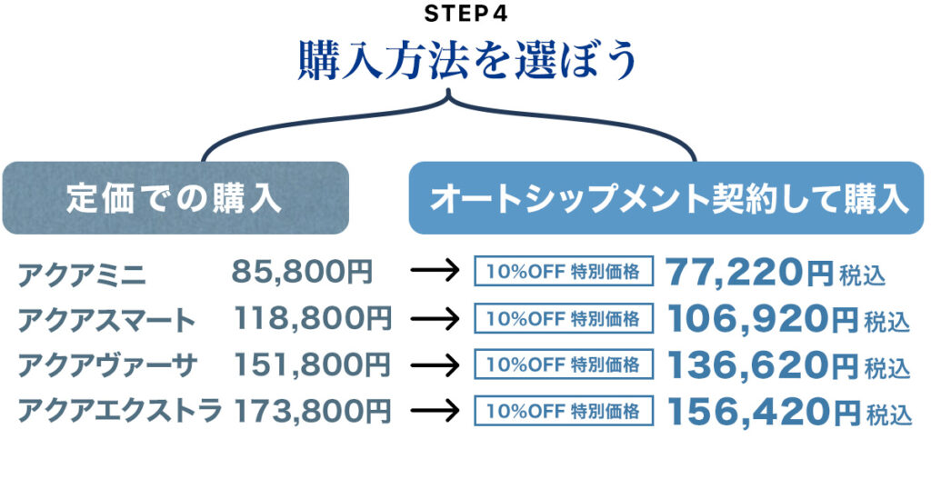 本体が10%オフになるのはもちろん、毎年ご配送するフィルターカートリッジも10%オフとなります。サービスの詳細についてはこちらから確認してみてください。