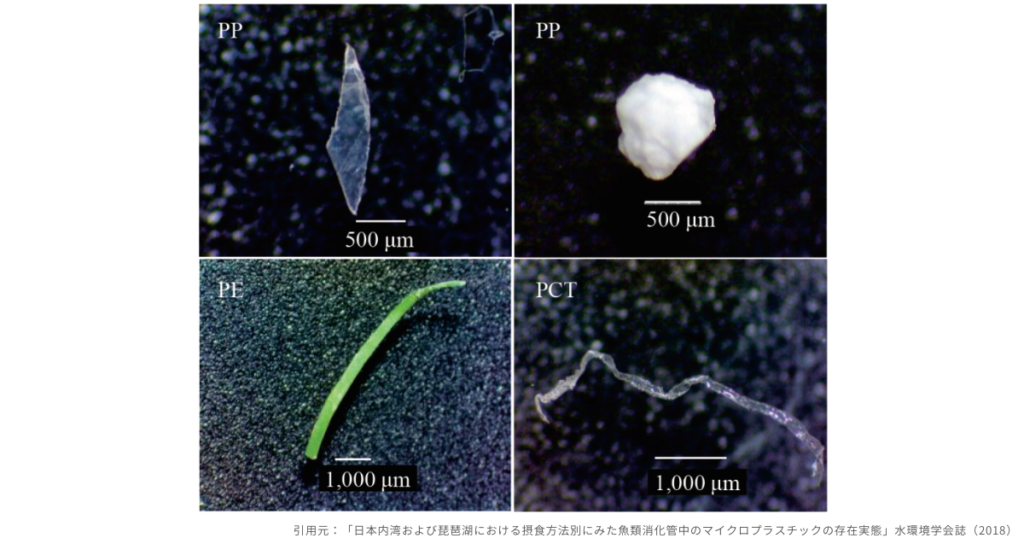 5ヶ所の日本内湾および琵琶湖において、7種類の魚を対象とし、その消化管のなかに存在している粒径100µm以上のマイクロプラスチックの実態把握を目的とした調査があります。
