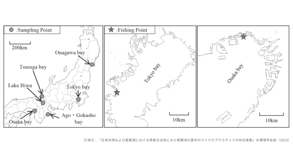 5ヶ所の日本内湾および琵琶湖において、7種類の魚を対象とし、その消化管のなかに存在している粒径100µm以上のマイクロプラスチックの実態把握を目的とした調査があります。