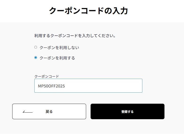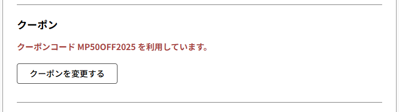 ②「クーポンを変更する」を押すと次の画面でクーポンコードの入力が可能です。