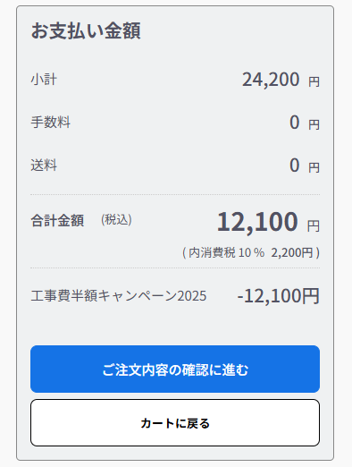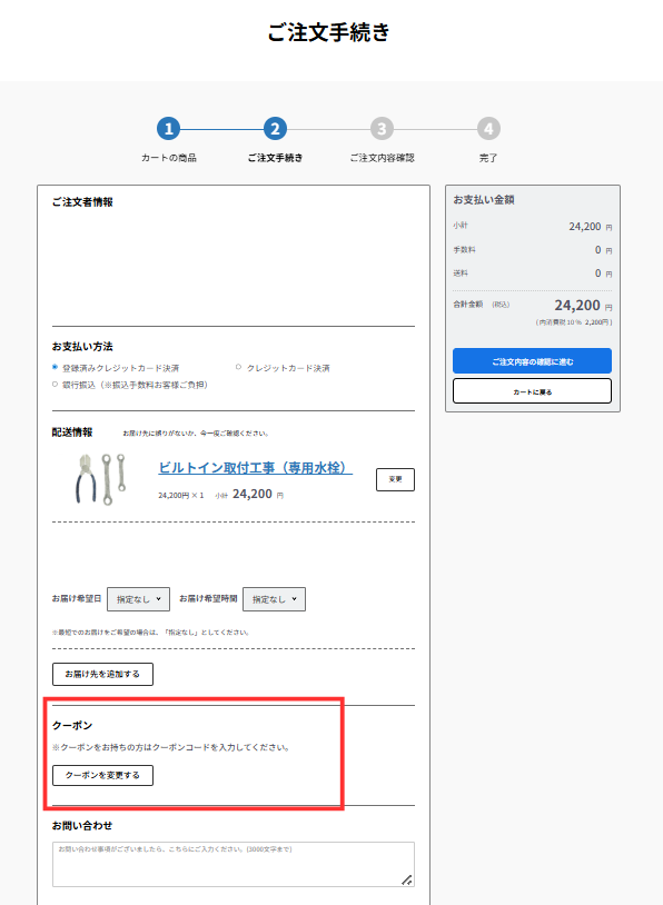①対象の工事費をカートに入れ、レジへ進み、「ご注文手続き画面」でクーポンの入力ができます。