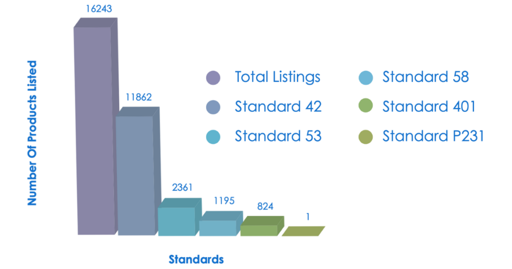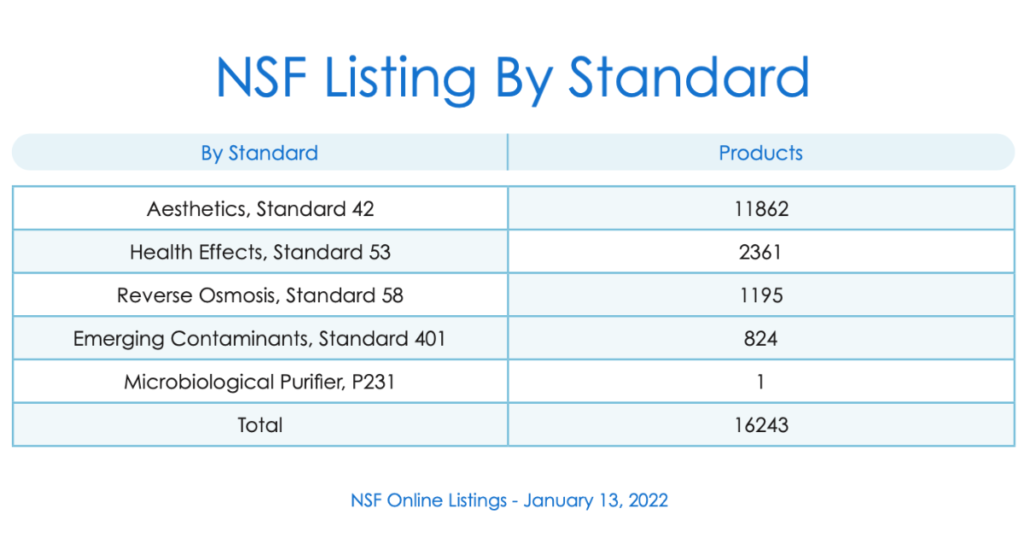 認証を受けた浄水器は、2022年時点で1万6,243台あります。なおNSFは、一度認証をあたえた機種に対してもくりかえし定期テストを実施するため、認証数は日々変動します(規格をクリアした台数が毎年増えつづけるばかりの規格とは異なります)。