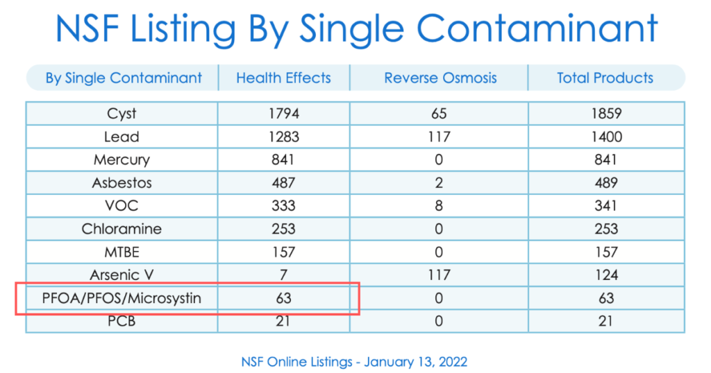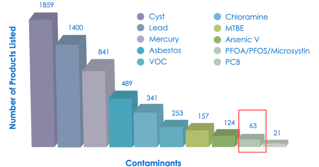 たとえば、最近よく日本で話題になっている有機フッ素化合物・PFAS(PFOA/PFOS)の除去性能について認められている製品は、ぜんぶで63種あることがわかります。