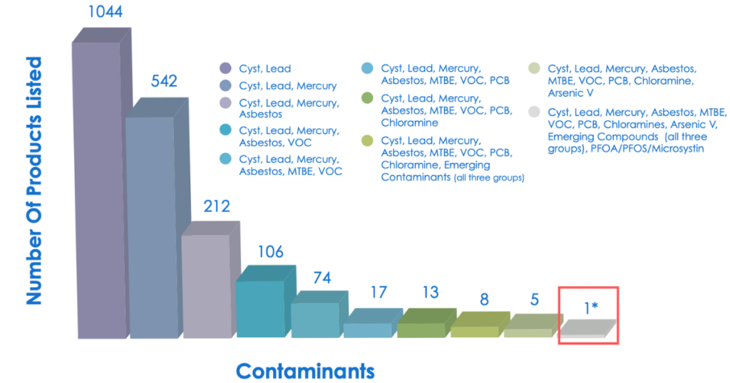 単一の有害物質の除去性能を軸に浄水器の認証数を把握したい際には、Single Contaminantを参照します。