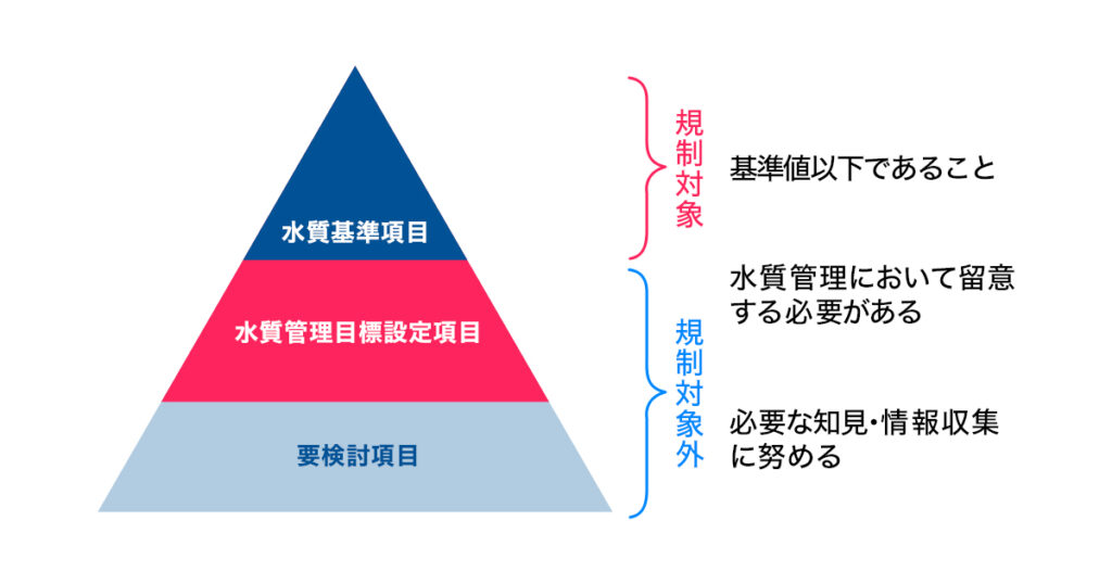 水道局などの水道事業体が管理する上水道の水質は、以下3つの基準で管理されています。