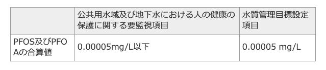 暫定的ではありますが、現状の目標値は、PFOSとPFOAの合算値で0.00005 mg/L以下(50ng/L以下)となっています。
