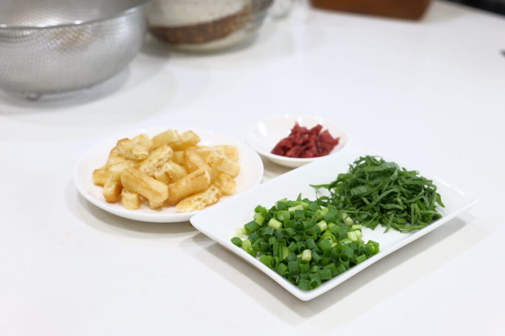 ②青じその葉はせん切りにします。しょうがは皮をむいてすりおろします。小葱は小口切りにします。