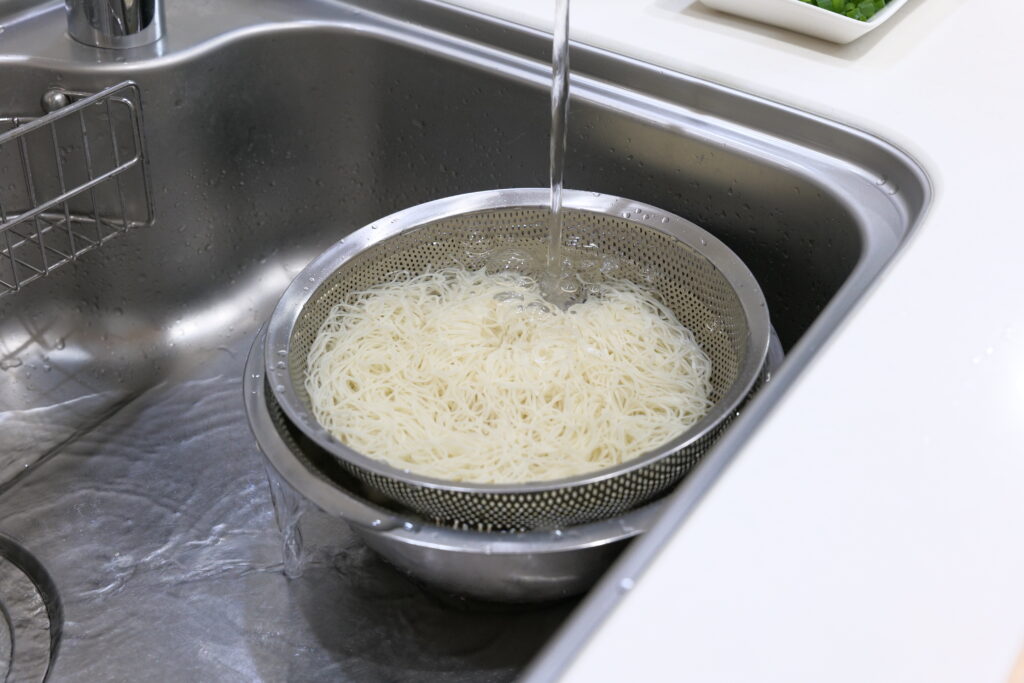 ④そうめんは浄水器の水をたっぷり沸かして茹でます。茹であがったら冷たい浄水器の水でよく洗い、水気をきります。