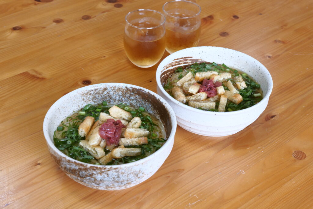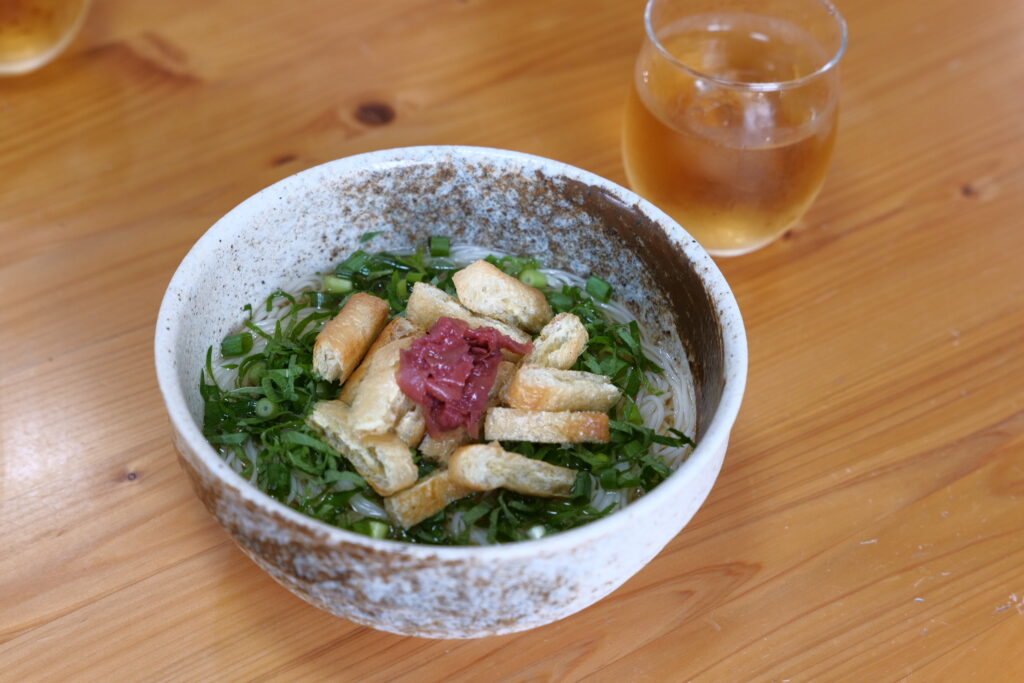 ⑤器に④のそうめんを入れて上に青じそとねぎと油揚げと梅干しとしょうがを天盛り、周りから①のつゆをかけます。