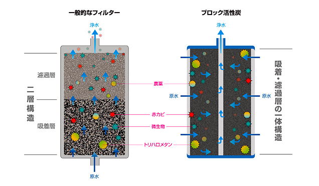 一般的な「粒状活性炭」とマルチピュアの「ブロック活性炭」の違い