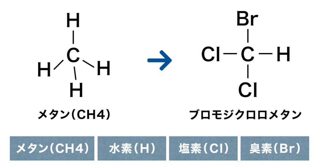 そして「トリハロメタン」とは、メタンの4つの水素原子のうちの3つが、ハロゲン原子(塩素や臭素)に置換した化合物を指します。3つなので「トリ」、ハロゲンの「ハロ」、「メタン」です(※上図の右)。
