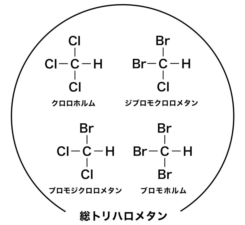 水道水の水質基準においては、トリハロメタンのうち以下の4種類が「総トリハロメタン」として厚生労働省によって定められています。