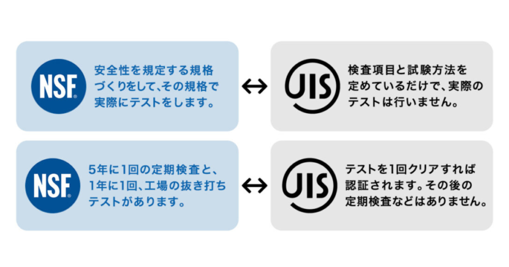 一方、国際的により信頼度の高い浄水性能試験は、中立的な第三者機関である国際認証NSFによって実施されています。
