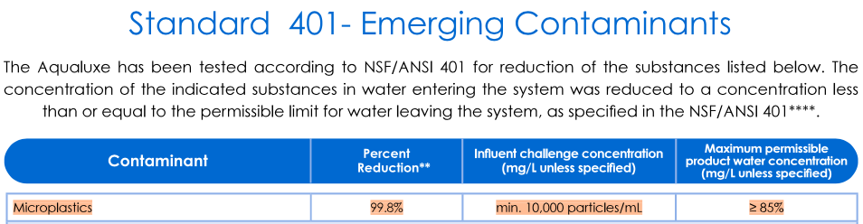 自社開発したすべての製品についてNSFの性能試験を受け、マイクロプラスチックの除去性能については以下のとおり「99.8%」の除去率にて認証されています。