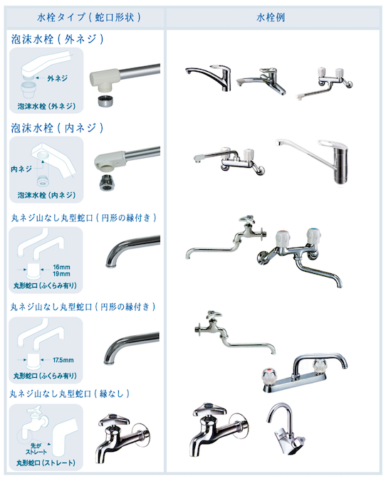 本体付属のアダプタで取り付けられる水栓(蛇口の形状)は大きく分けて下記5種類となります。